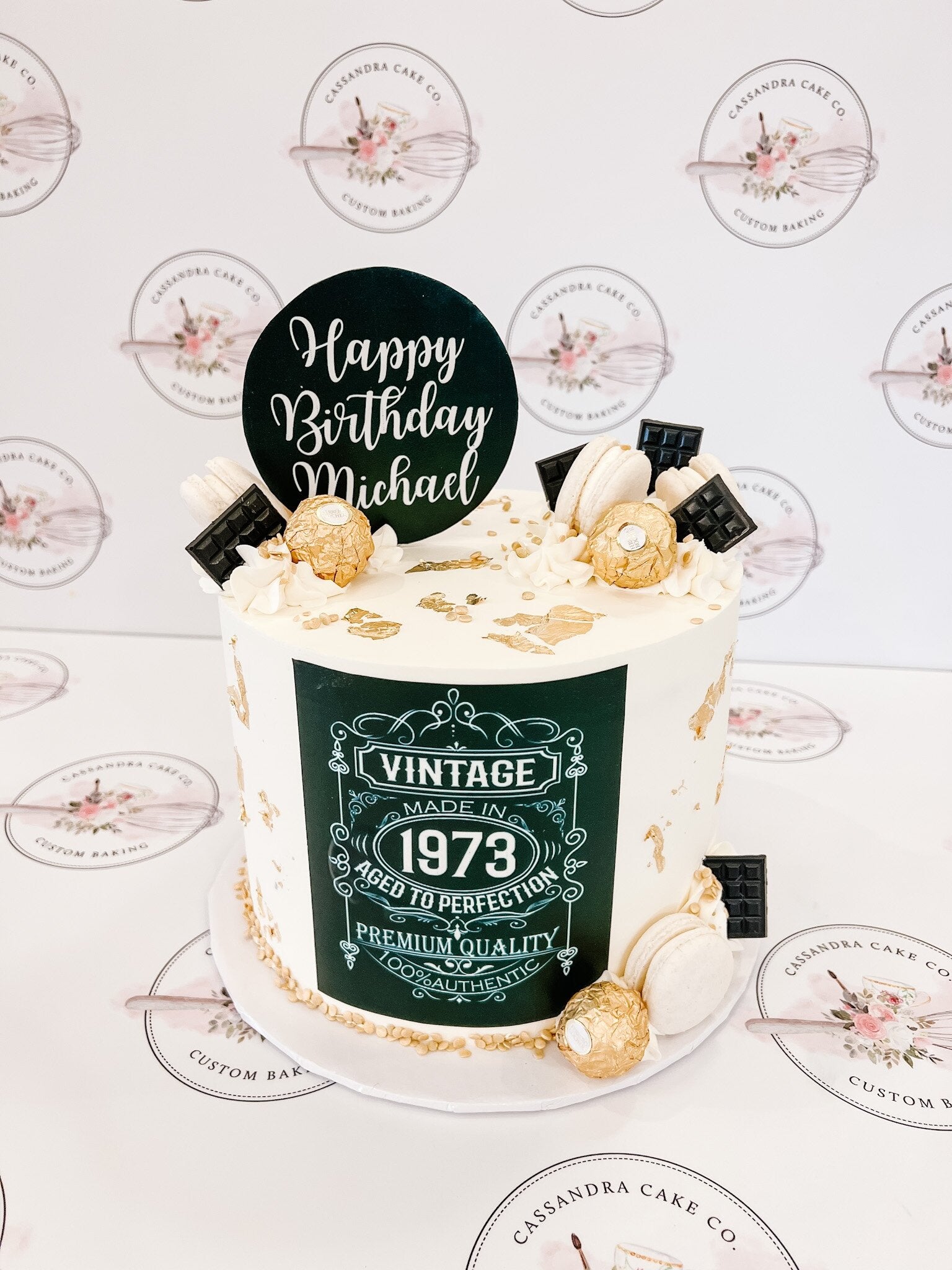 White cake with black vintage edible image design, topped with macarons, chocolate bricks, and gold flakes.