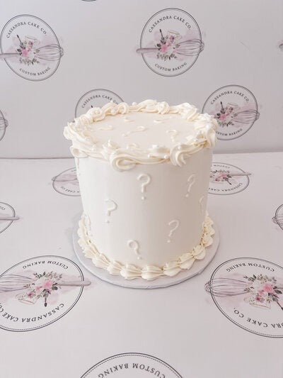 White cake with piping and question mark decorations. Cake colour inside to correspond with reveal.