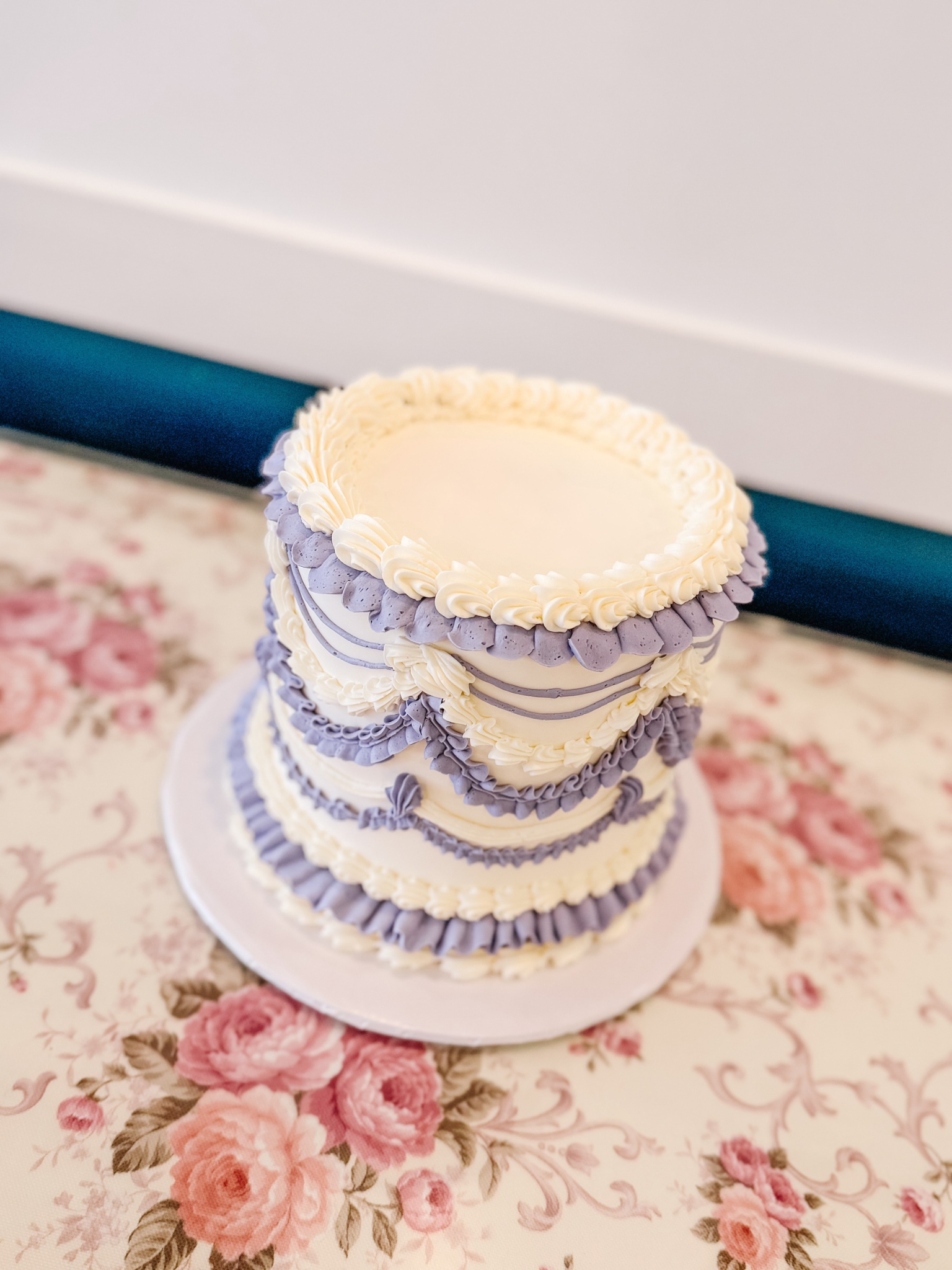 White cake base with 2 colours of vintage piping.